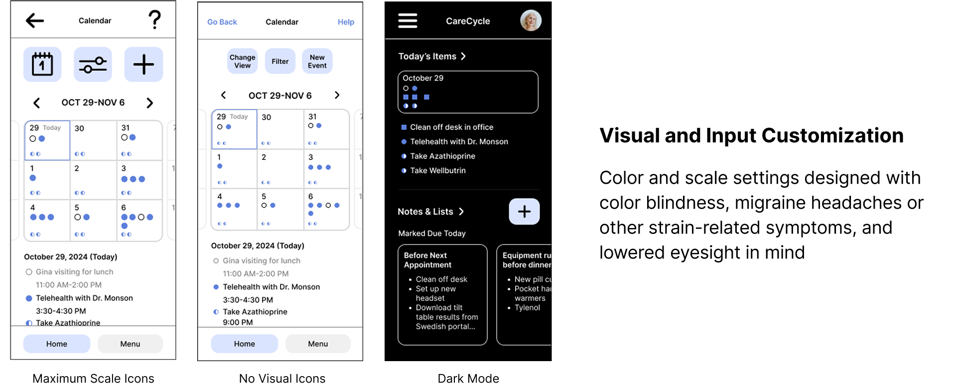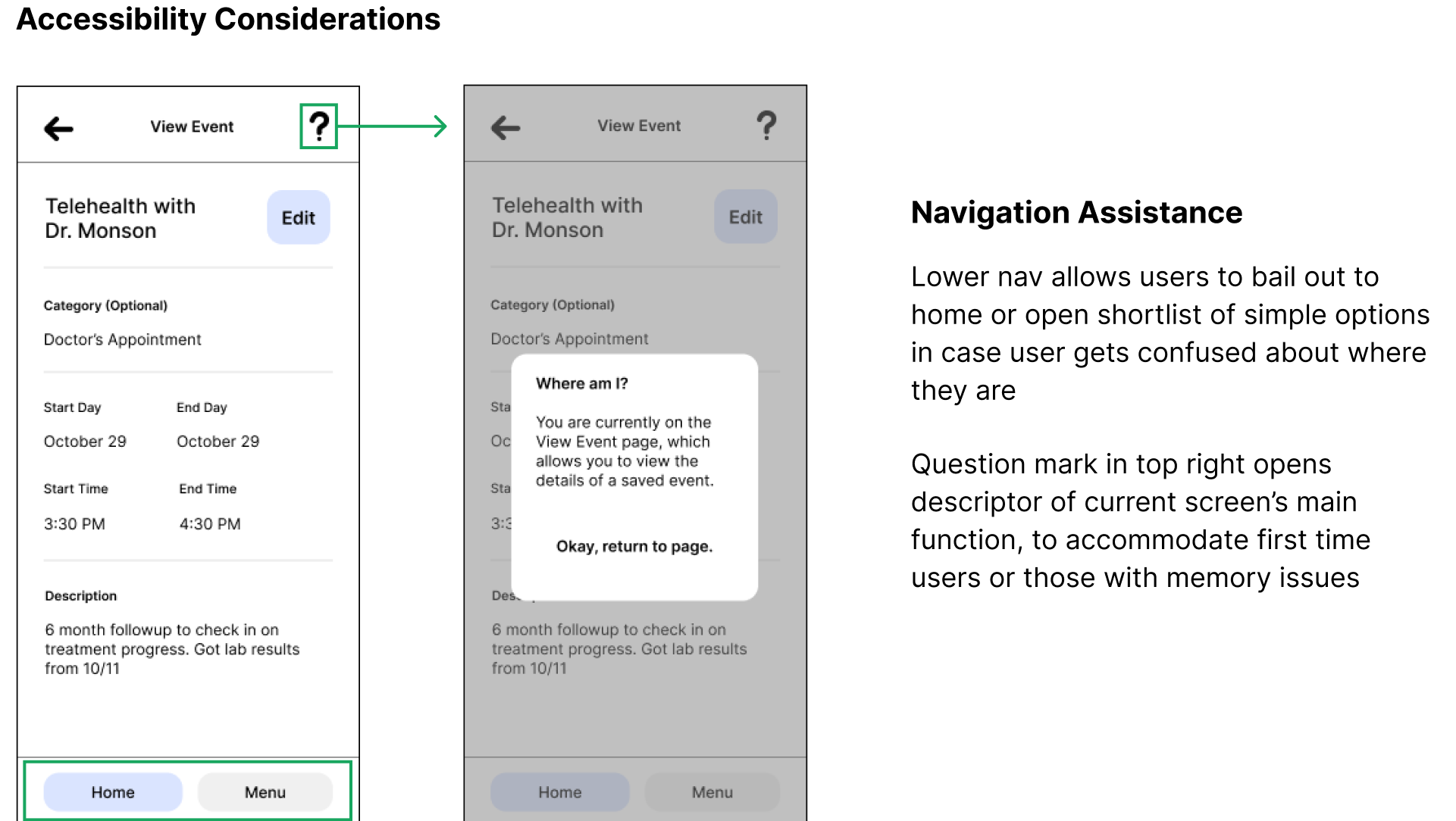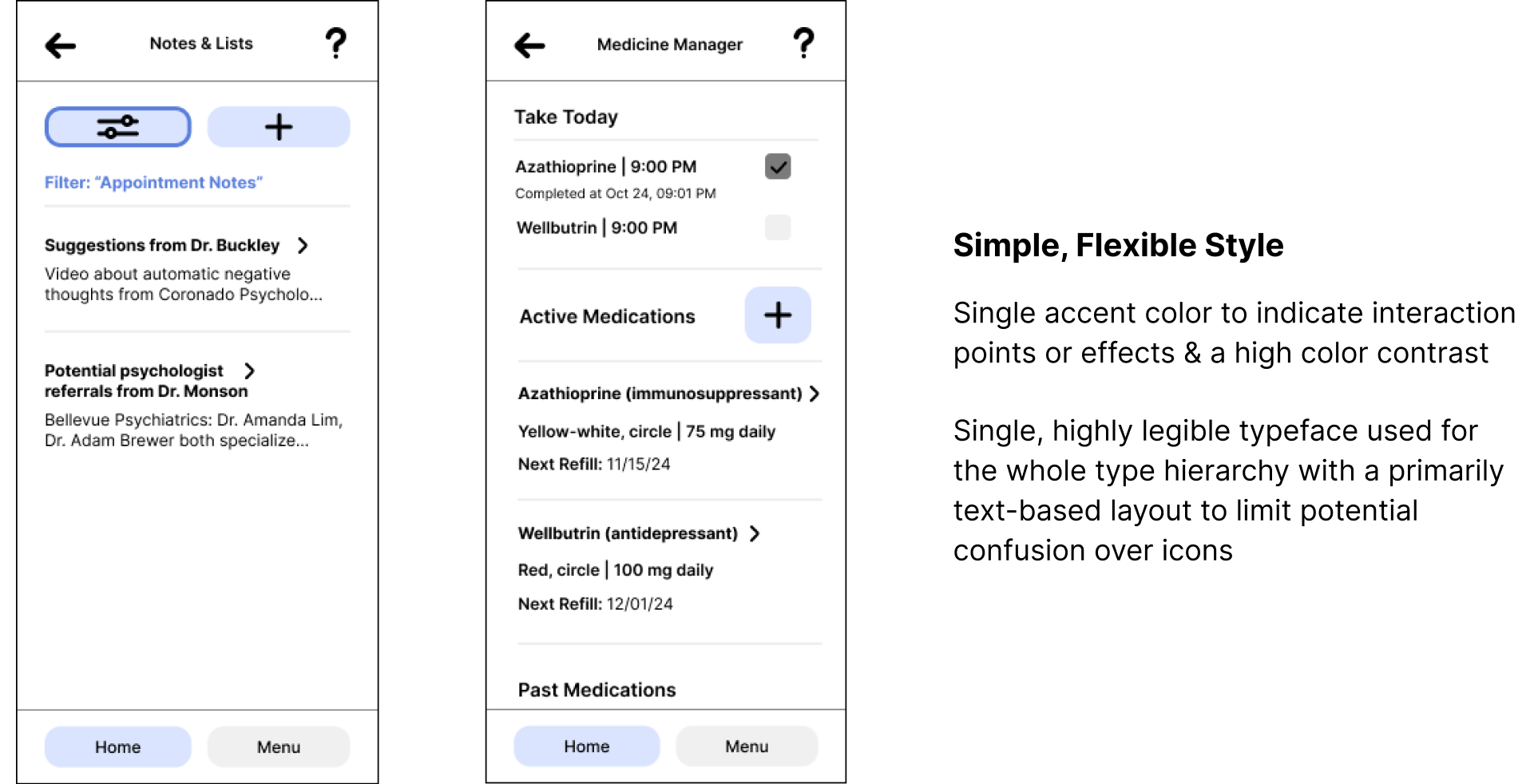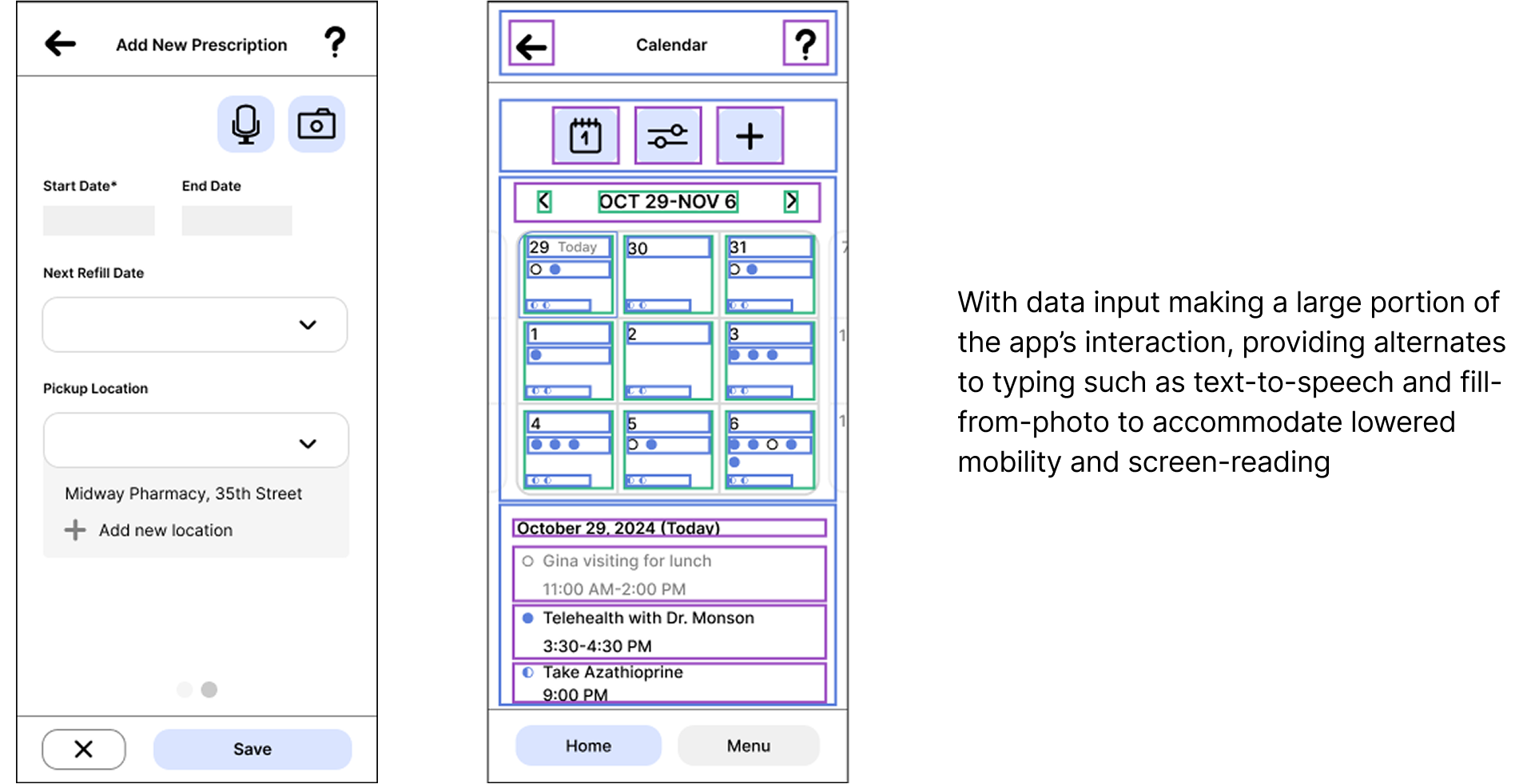 Given my findings about comorbidity in the market research phase, investigating accessibility guidelines and implementing features that accommodated for things like lowered eyesight and coordination was important. With the scope of the project, I focused on exploring accessibility in three different areas.