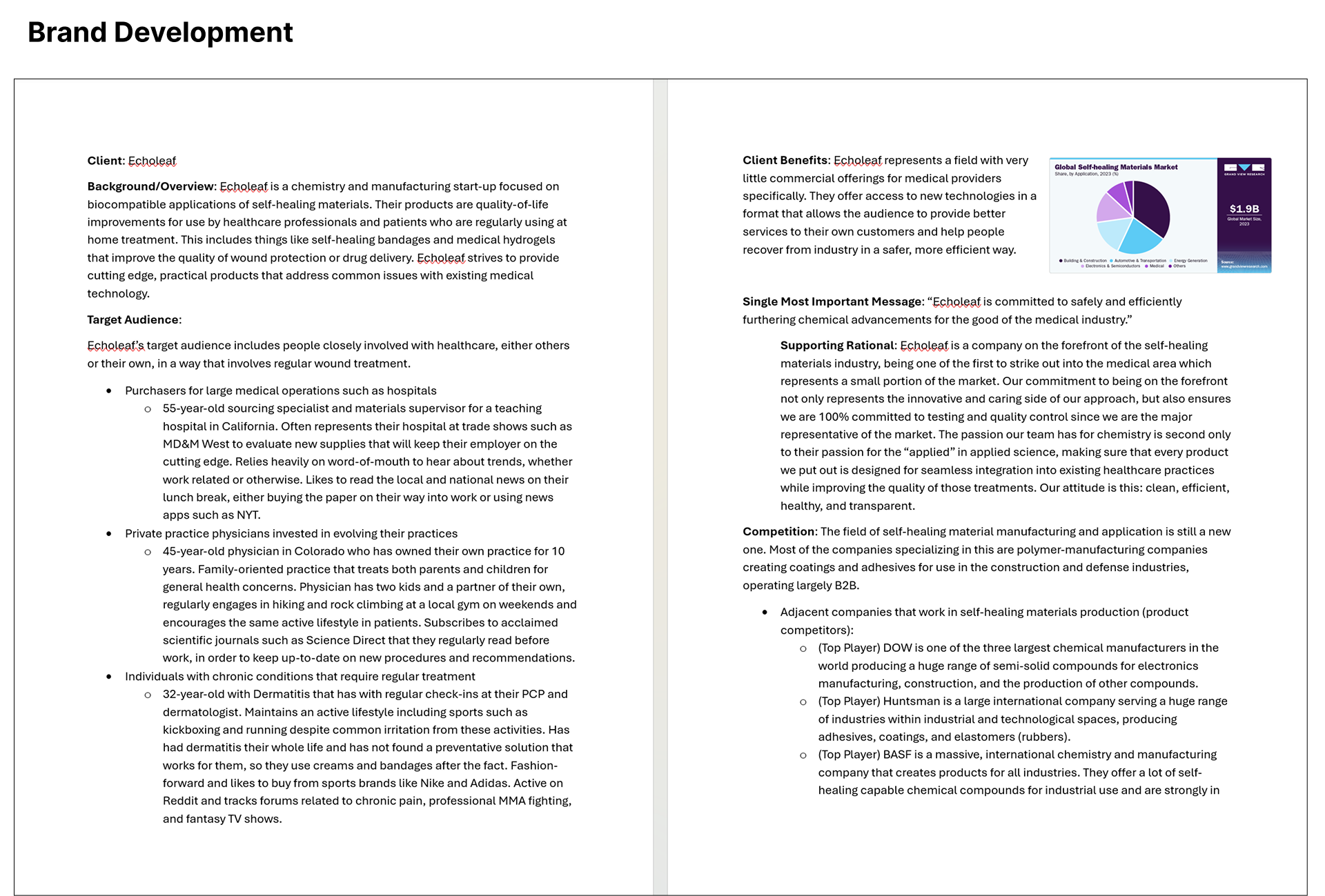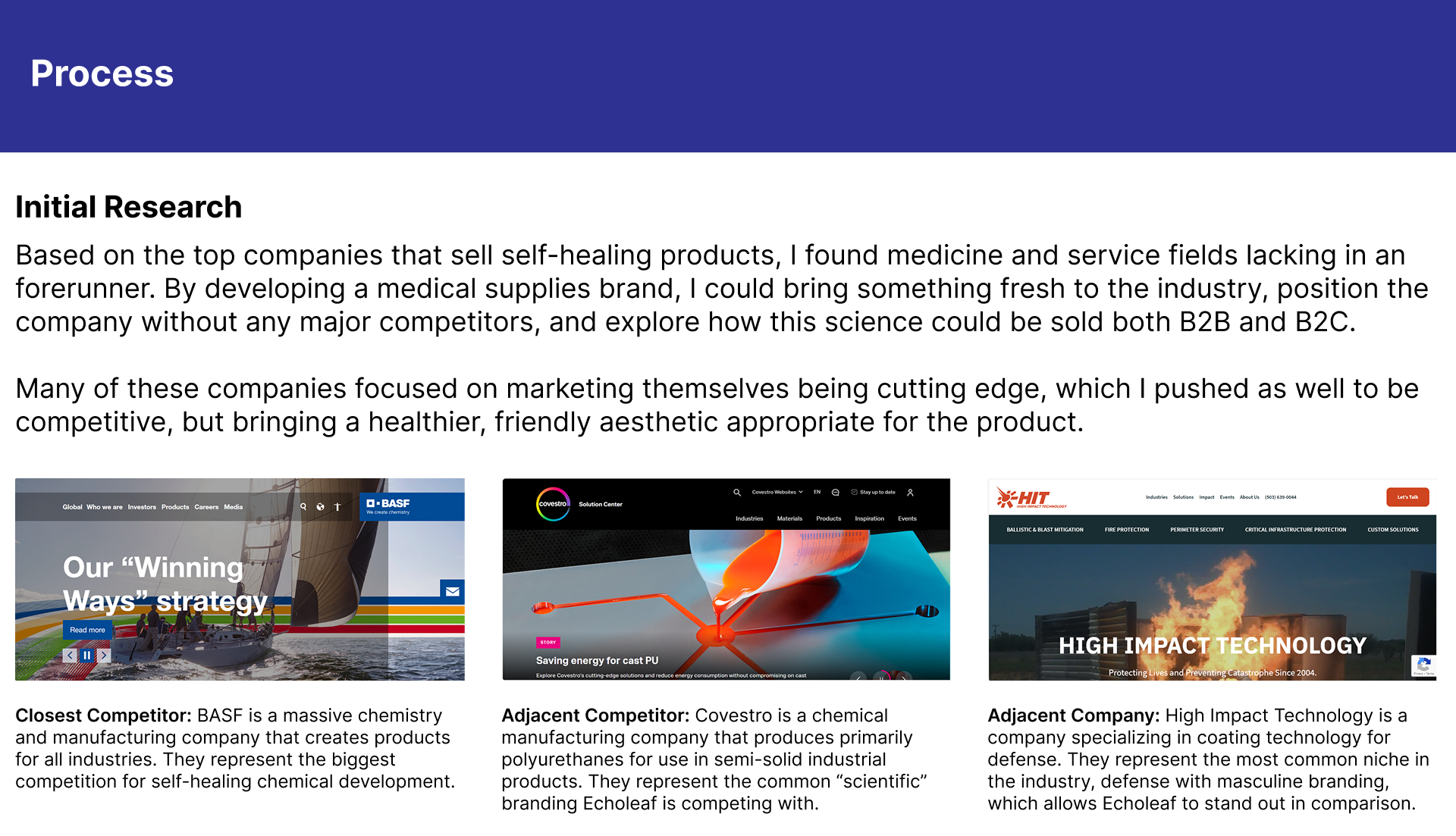 After exploring competitors and identifying the medical niche, I created a write-up that honed in on the brand’s positioning, including their messaging, audience, and value proposition before jumping into visuals.